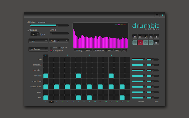 Una caja de ritmos que te permite crear y guardar patrones de ritmo.